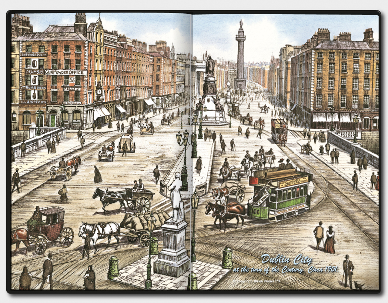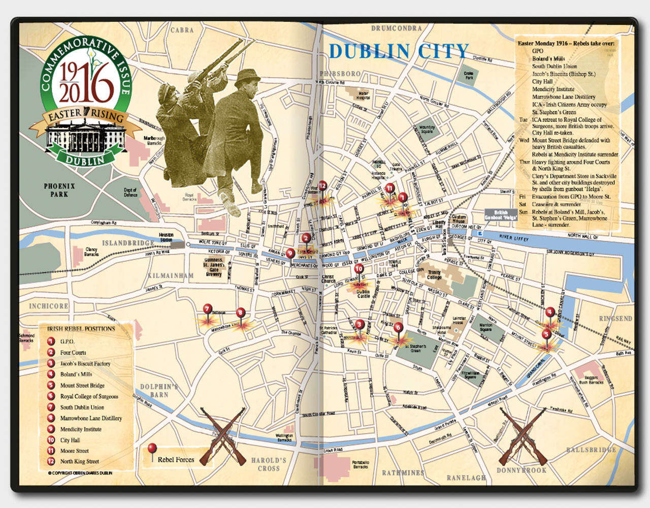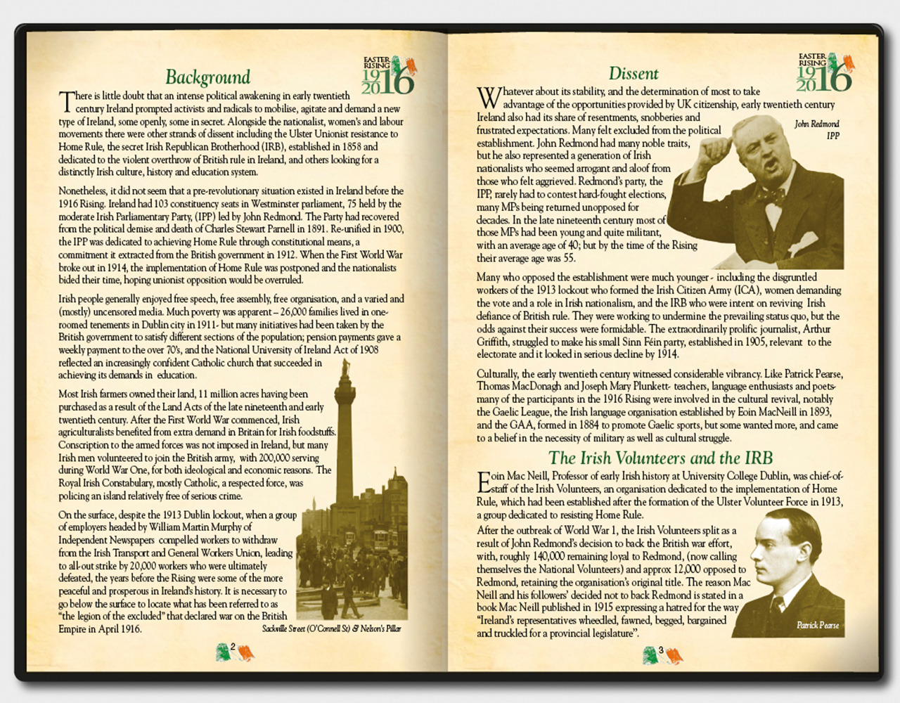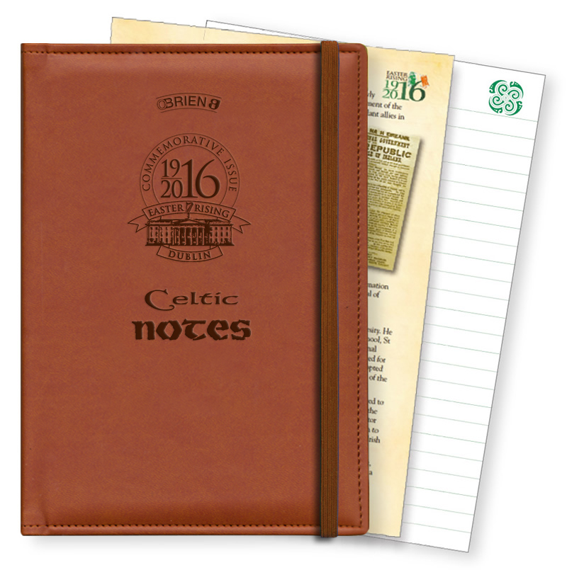 The Story of the 1916 Rising - in a Notebook/Journal! A Unique Irish Writing Journal/Notebook - with 24 pages of interesting Historical Photos and Text at the front, compiled by well known historian Diarmaid Ferriter - Followed by 96 Notes pages with Pale Green lines and miniature Celtic images.Deluxe Edition featuring:- Monaco Tan Embossed 'Stitched Edge' Cover with Tan Elastic Closure.- Featuring 24 colour pages of Photos & text.- Casebound & thread sewn for strength,- Gilded page edges.- "Ireland" ribbon markerSize: A5 (148 x 210mm, 6 x 8.5 in.)A Unique and Special Gift for that 'speclial person'